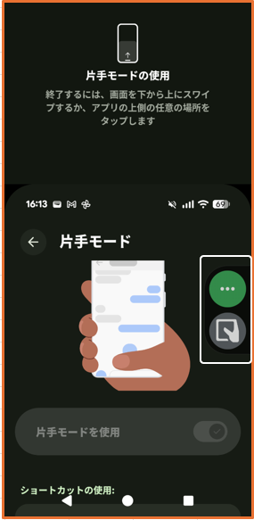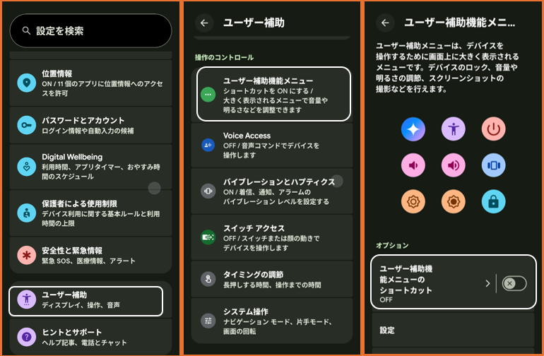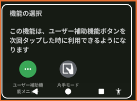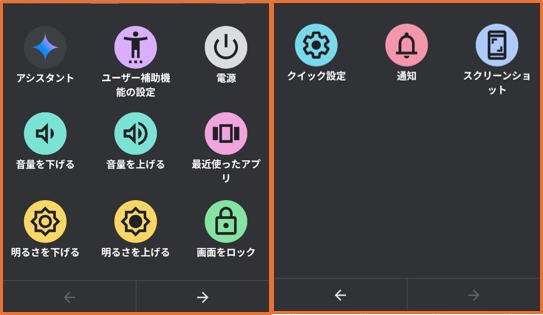 片手操作が難しい場合や、物理ボタンの使用が困難な場合に、画面上のタッチ操作で主要な機能を呼び出せるようになります。