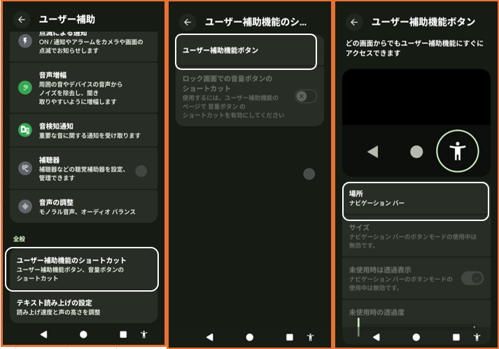 【設定】>【ユーザー補助】>【ユーザー補助機能のショートカット】>【ユーザー補助機能ボタン】>【場所】をタップします。
