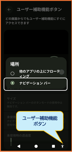 「ナビゲーションバー」を選択すると、ナビゲーションバーの一番右に「ユーザー補助機能ボタン」が表示されます。このボタンをタップすると、「ユーザー補助機能メニュー」にアクセスできます。