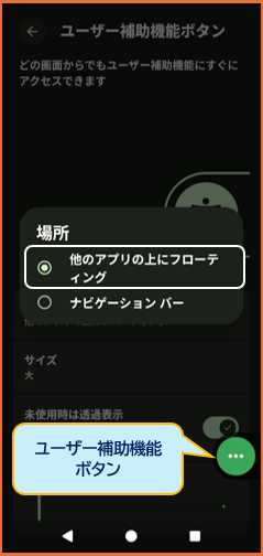 「他のアプリの上にフローティング」を選択すると、画面にフローティングボタンが表示されます。このボタンをタップすると、「ユーザー補助機能メニュー」にアクセスできます。