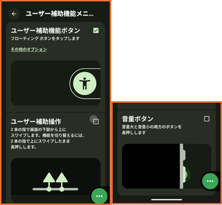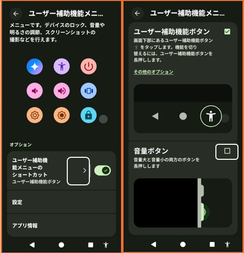 「音量ボタン」を選択すると、音量ボタンの「大」「小」を同時に長押ししたときに、ユーザー補助機能メニューにアクセスできます。