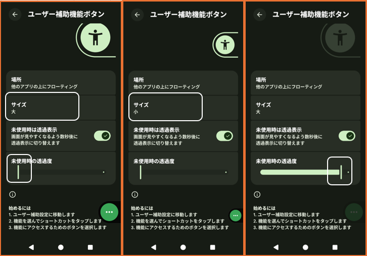 フローティングボタンは、その大きさ(「小」「大」)と使用していないときのボタンの透明度をカスタマイズできます。