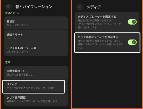 ロック画面にメディアプレイヤーを表示するには、【設定】>【音とバイブレーション】>【メディア】>「ロック画面にメディアを表示する」を有効にします。