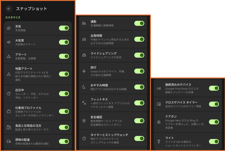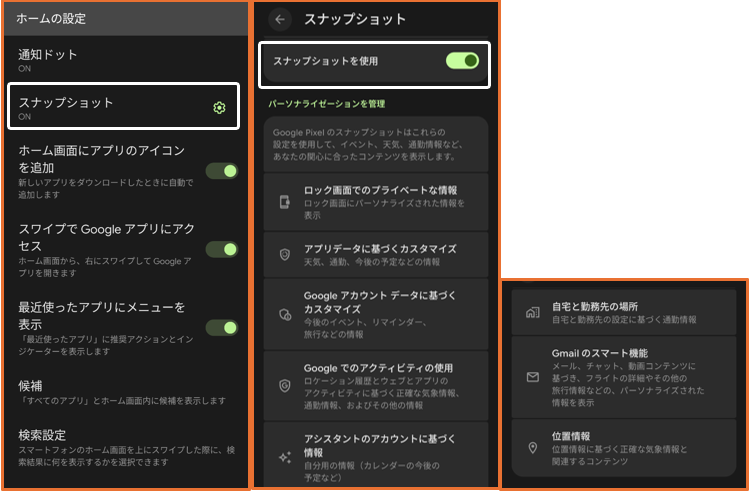【ホームの設定】>【スナップショット】>【スナップショットを使用】を有効にします。※非表示したい場合は「無効」に。