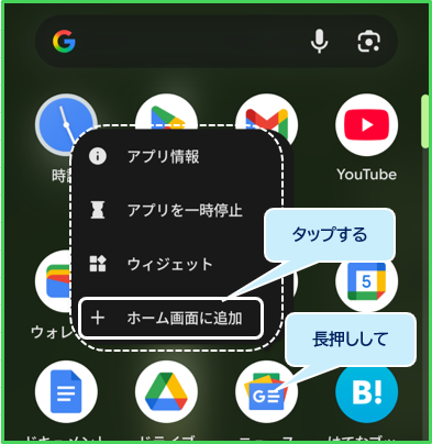 一部のアプリでは、アプリアイコンを長押しすると、アプリ内の特定の機能へ直接アクセスできるショートカットリストが表示されます。このリストの中のアイコンも、アプリアイコンと同様に長押ししてホーム画面にドラッグ&ドロップすることで追加できます。
