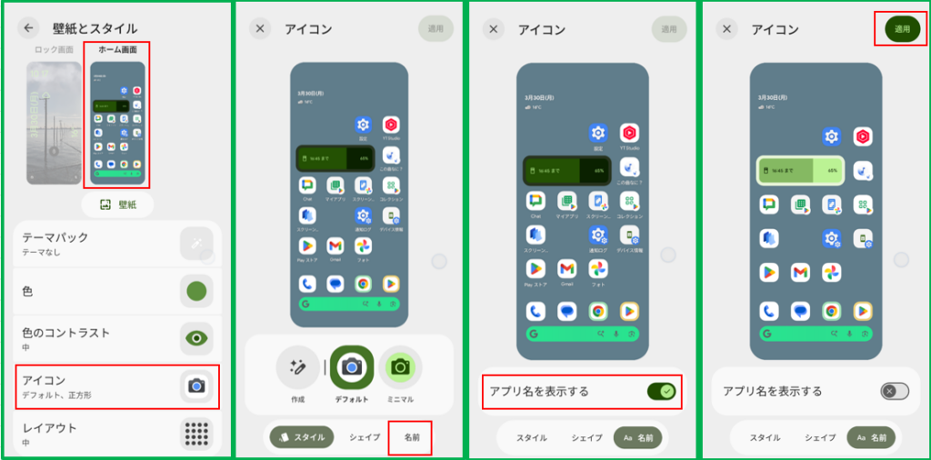 【壁紙とスタイル】>【ホーム画面】>【アイコン】>「名前」>「アプリ名を表示する」を無効にします。