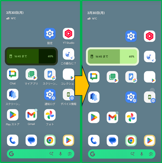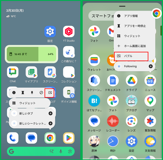 ※「カメラ」「My Pixel」アプリは、バブル非対応。