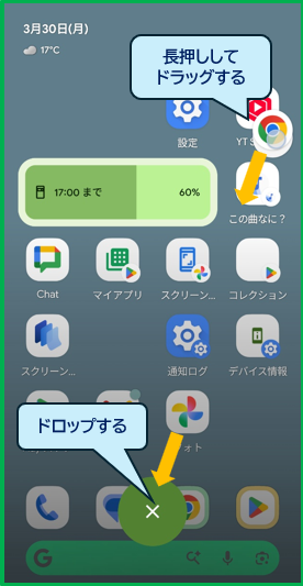 そのバブル(アイコン)を長押しして、画面下部の「✖」まで、ドロッグ&ドロップします。