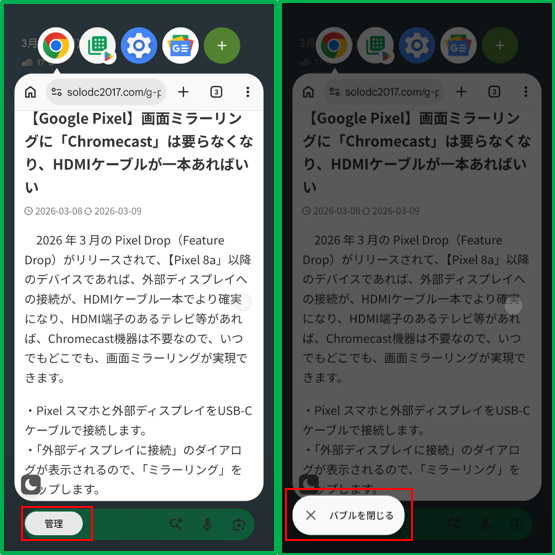 または、「管理」をタップして、「バブルを閉じる」をタップすると、左端(最近)のウィンドウが閉じます。