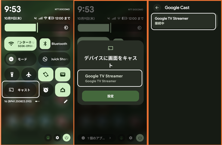 【設定】>【接続設定】>【接続の詳細設定】>【Google Cast】>「Chromecast」(Google TV streamer)をタップします。