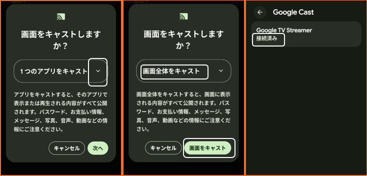 ③「画面をキャストしますか?」で「画面全体をキャスト」を選択して、「画面をキャスト」をタップします。