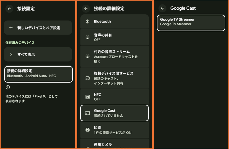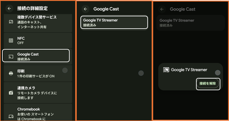 【設定】>【接続設定】>【接続の詳細設定】>【Google Cast】⇒「Chromecast」(Google TV Streamer)をタップ⇒「接続を解除」をタップします。