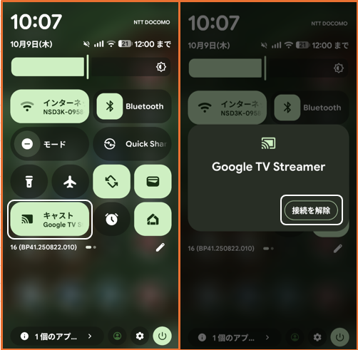 クイック設定パネルを開いて、「キャスト」タイルをタップして、「接続を解除」をタップします。