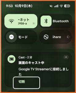 通知シェードを開いて、「Cast」の通知パネルの「切断」をタップします。