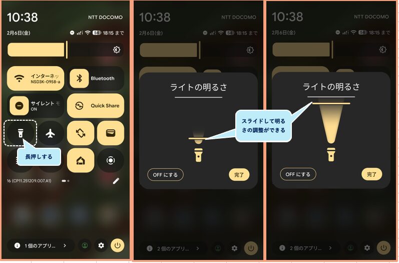 2.フラッシュライト(懐中電灯)の明るさを調整して点灯できる