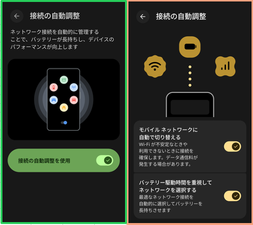 【設定】>【ネットワークとインターネット 】>【 接続の自動調整 】において、これまで「接続の自動調整を使用」のみで管理されていましたが、新たに「モバイルネットワークに自動で切り替える」と「バッテリー駆動時間を重視してネットワークを選択する」という 2 つのオプションに分割されています。