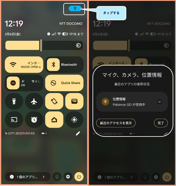 クイック設定を開くと、このドットが展開されて、タップすると、どのアプリが位置情報を使用しているかが明示されます。そこからアプリを停止したり、権限を変更したりすることも可能です。