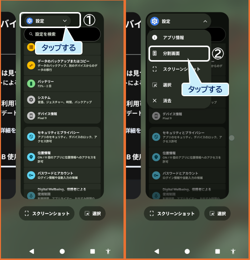 ①最近使ったアプリ画面を開いて、画面を左右にスワイプして、画面分割にしたいアプリのサムネイルアイコンをタップして