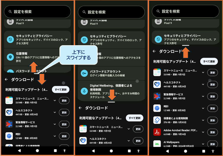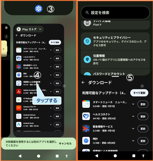 ④下側画面には、最近使用したアプリが表示されるので、左右にスワイプして、下側に表示したいアプリを選択(タップ)します。※【最近使用したアプリ】画面には、2つ以上のアプリが必要です。