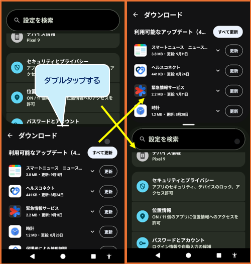 上下のアプリを入れ替えるには、境界中央のバーをダブルタップします。