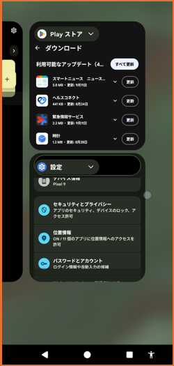 「画面分割」のまま、新たなアプリを開いたり、ホーム画面に戻ると、「画面分割」は画面上解消されますが、最近使ったアプリ画面に履歴として残っているので、いつでも再表示可能になります。