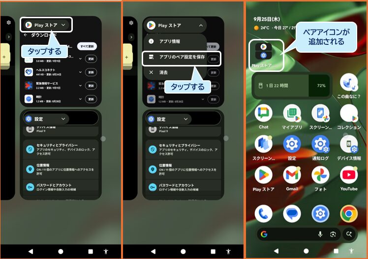 【Android 15】からは、あらかじめセットされた2つのアプリのペアアイコンをホーム画面に追加して、そこからも起動できるようになっています。