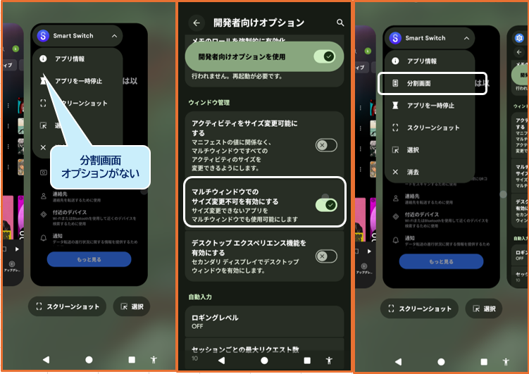 「開発者向けオプション」を開いて、「マルチウィンドウでのサイズ変更不可を有効にする」のトグルを右にスライドします。