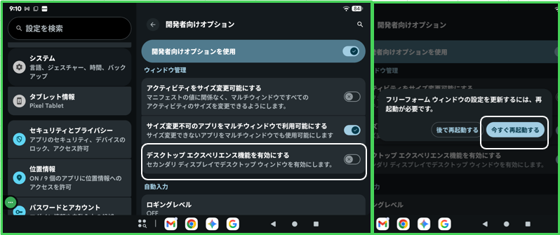 「Pixel Tablet」で「デスクトップ モード」を利用するには、「開発者向けオプション」から[デスクトップ エクスペリエンス機能を有効にする]を 有効にして、再起動します。