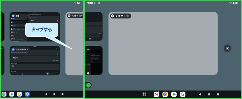 ※タスク一覧の「デスクトップ モード」アイコンをタップしなくても、開いているアプリから直接「デスクトップモード」にできます。