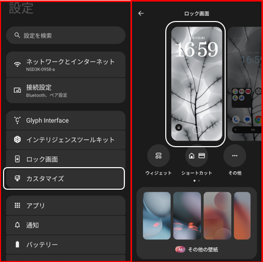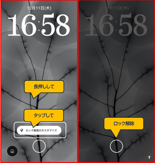 ロック画面上を長押し>「ロック画面のカスタマイズ」をタップ>ロック解除