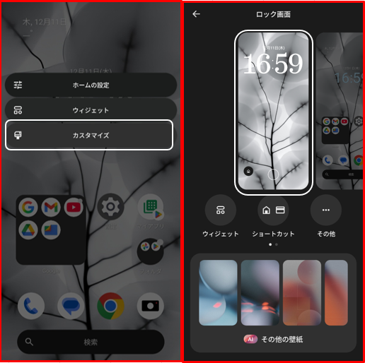 ホーム画面上を長押し>「カスタマイズ」をタップ>「ロック画面」をタップ