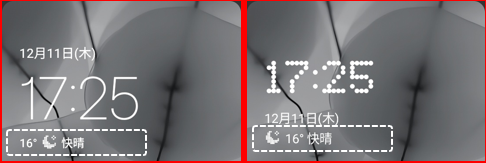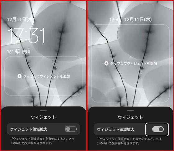 ・デフォルトは、4×2グリッドですが、「ウイジェット領域拡大」トグルを右にスライドすると、「4×4」グリッドに広げることができます。拡大すると、時計の文字盤は見えなくなります。