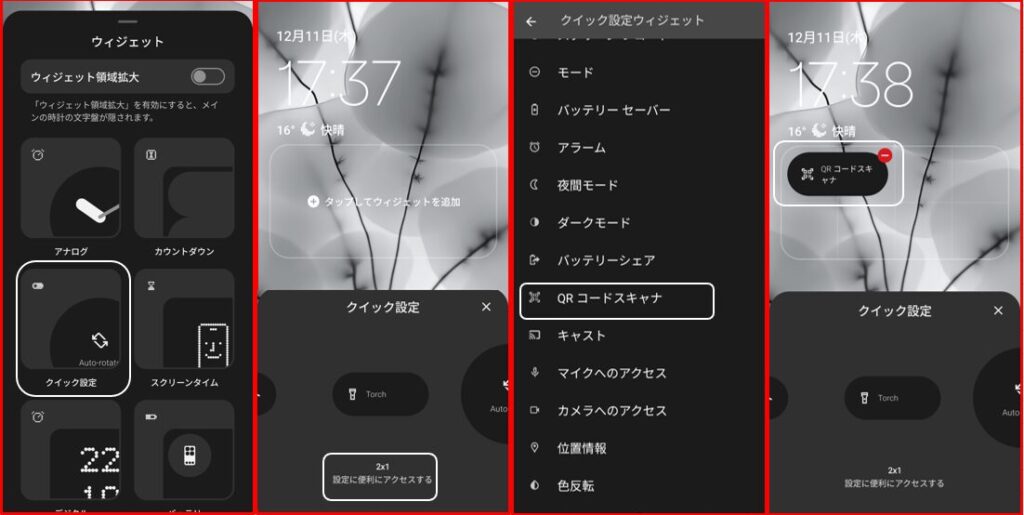 ・ウイジェットの追加:ウイジェットを選択して、サイズを選択してタップします。(ここでは「クイック設定」を選択したので、さらに機能を選択しています)