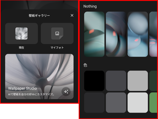 ・ウイジェット領域をタップすると、Nothing独自のウイジェットから選択できるようになります。