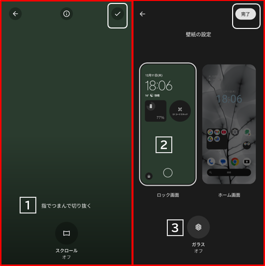 ①ピンチアウト/インで、画像を拡大/縮小できます。⇒右上のチェックをタップします。