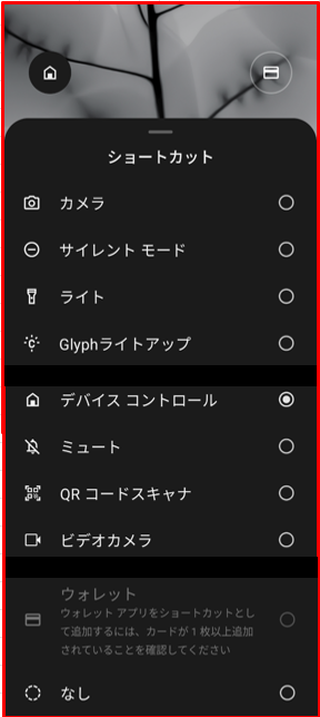 追加できるショートカットは、「カメラ」「サイレントモード」「ライト」「Glyphライトアップ」「デバイスコントロール」「ミュート」「QRコードスキャナ」「ビデオカメラ」「ウォレット」になります。