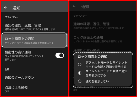 ・「サイレントモードでの会話と通知を非表示にする」 ⇒ 通知音を鳴らさないようしたアプリ(カテゴリ)からの通知は非表示になります。