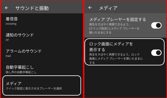 【設定】>【サウンドと振動】>【メディア】>「ロック画面にメディアを表示する」トグルを右にスライドして、有効にしていると、ロック画面にメディアプレイヤーを開いたままにして、再生/一時停止等が素早くできるようになります。