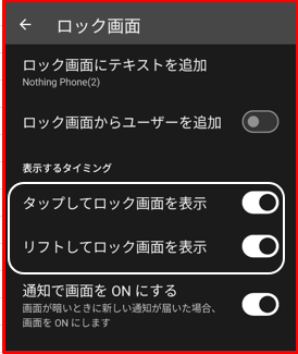 【ロック画面】の設定で「リフトしてロック画面を表示」トグルを右にスライドして有効にします。