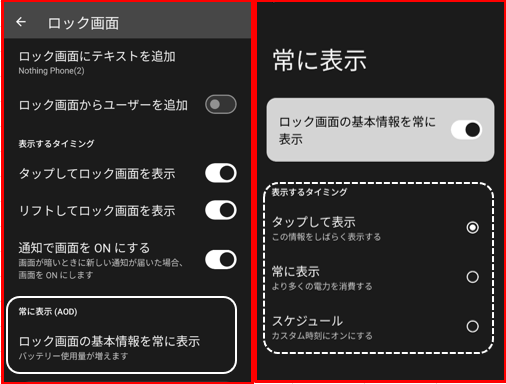 AODを表示するには、【設定】>【ロック画面】>【ロック画面の基本情報を常に表示】>【ロック画面の基本情報を常に表示】トグルを右にスライドして有効にします。