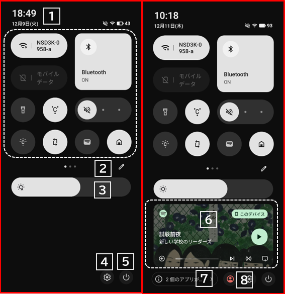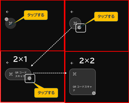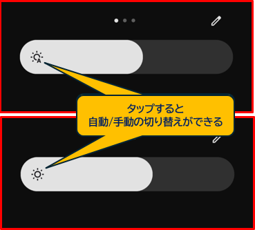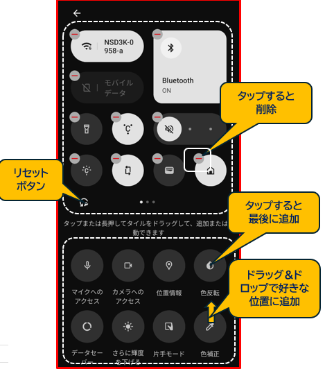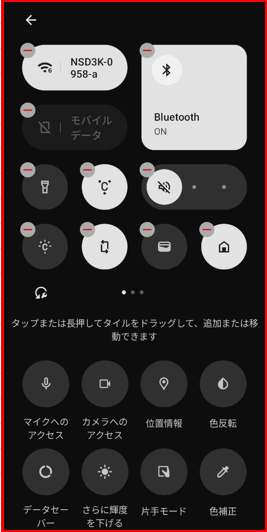 タップすると、「クイック設定」のトグル部分(タイル)のカスタマイズ(追加/削除/並べ替え&サイズ変更)ができます。(⇨※3.参照)