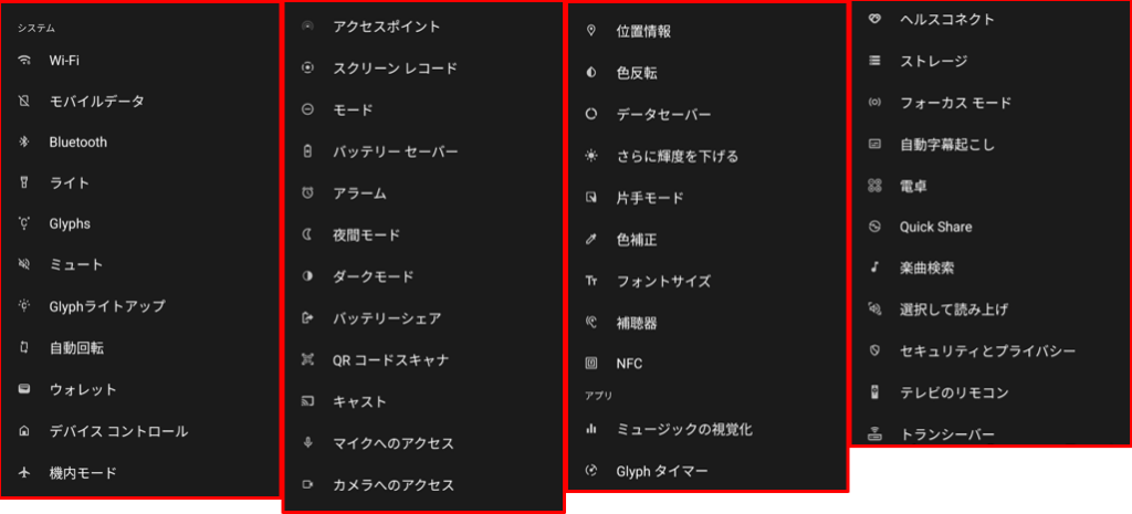 クイック設定パネルは、主にその機能の「ON」/「OFF」をタップすることで切り替えることができる「トグル」の集合体になります。