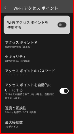 ・タップ:「Wi-Fiアクセスポイントを使用する」のON/OFFの切り替え