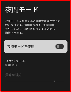 夜間モードは、ディスプレイの色温度を暖色系(オレンジがかった色)に調整し、ブルーライトを低減して夜間の目の疲れや睡眠への影響を軽減します。