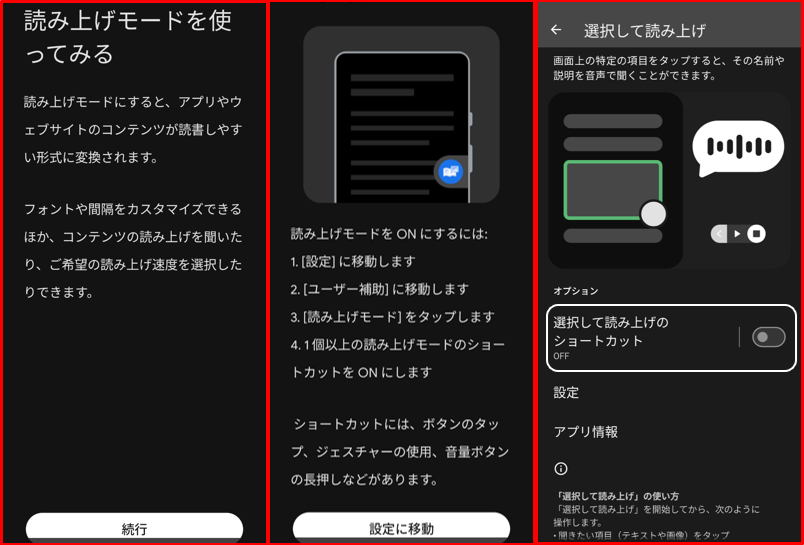 利用するには、「選択して読み上げのショートカット」を有効にします。
