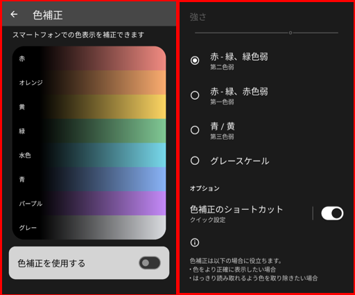・タップ:「色補正を使用する」のON/OFFの切り替え