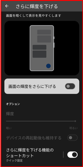 ・タップ:「画面の輝度をさらに下げる」のON/OFFの切り替え