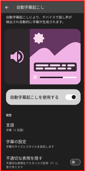 「自動字幕起こし」(Live Caption)は、デバイス上で音声をリアルタイムにテキスト化し、字幕として表示するアクセシビリティ機能です。