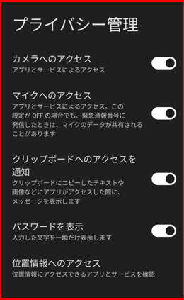 ・タップ:「マイクへのアクセス」のON/OFFの切り替え(OFF:システム全体でマイクが利用できなくなる)