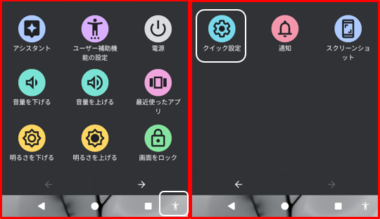 「ユーザー補助機能メニュー」を開いて、「クイック設定」ボタンをタップします。